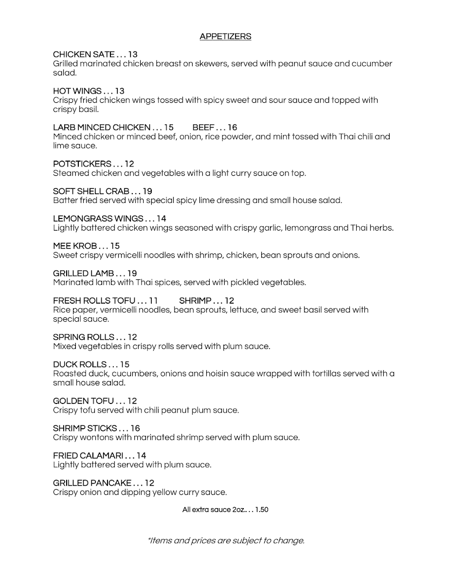 Minced chicken or beef, onion, rice powder, and mint tossed with Thai chili and lime sauce
