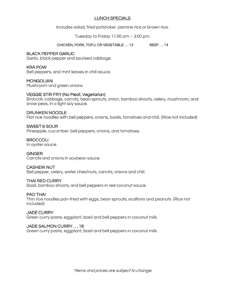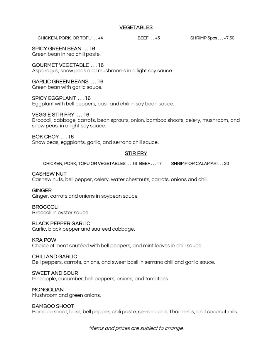 1. Sautéed with black pepper garlic sauce and steamed vegetable. 2. Lemongrass sauce with bell peppers and basil